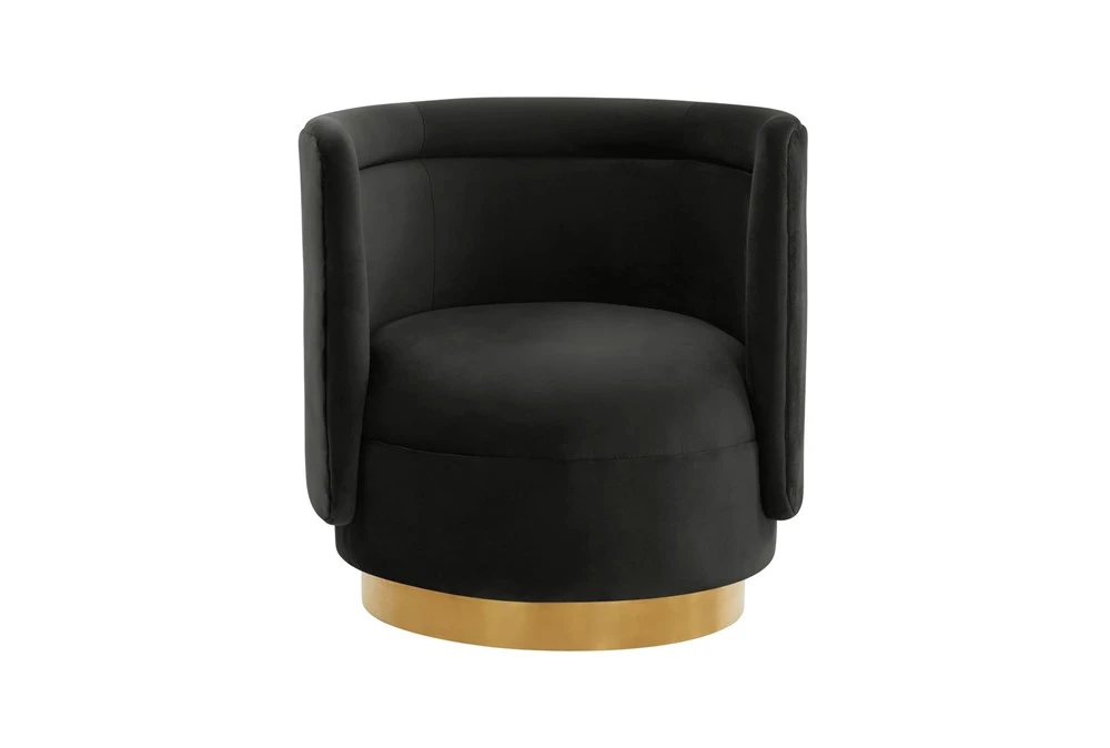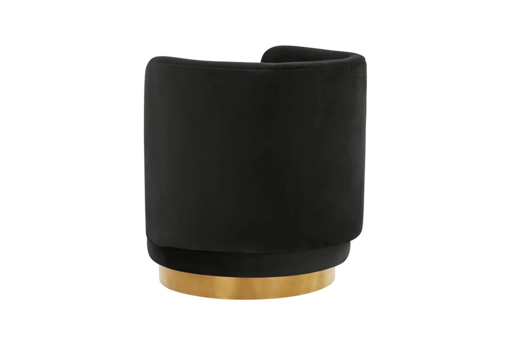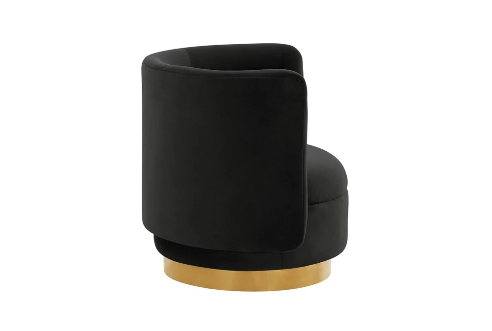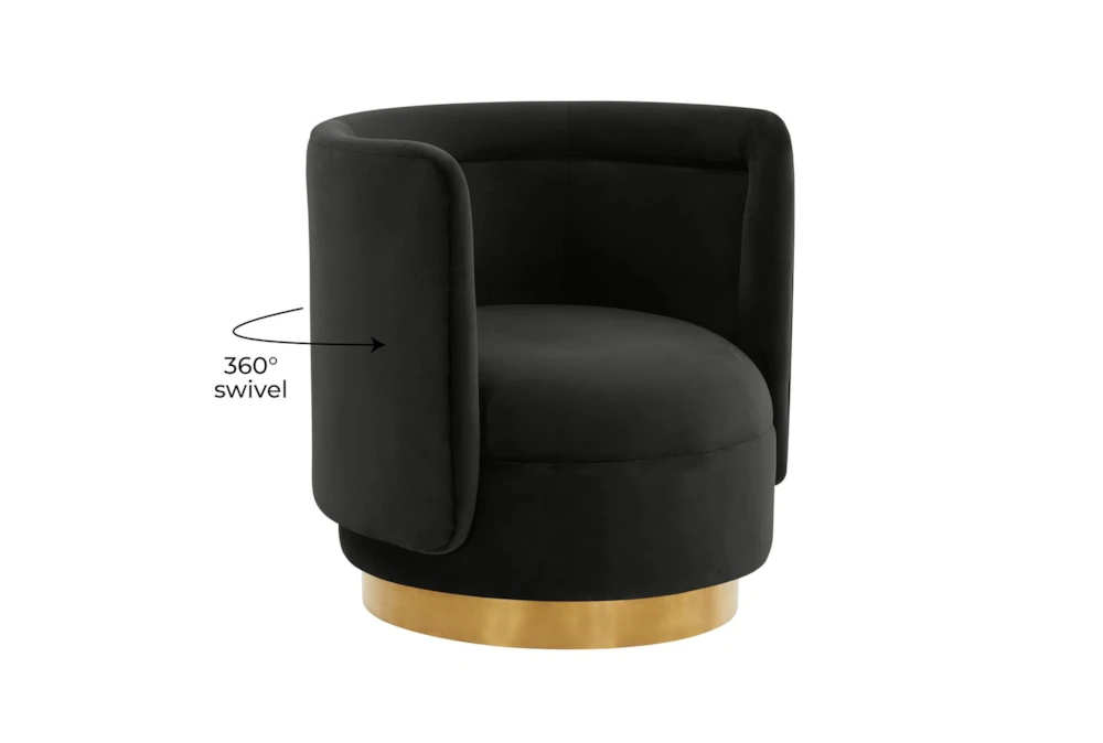 The Clarke Black Velvet Swivel Accent Chair is a modern and stylish addition to any living room, featuring a curved design, foam cushions, and a tight back. Handmade by skilled furniture craftsmen, this chair is made with a kiln-dried pine frame with spring support and boasts a 360 degree swivel for added convenience. Other properties include a black velvet material and availability in several colors.