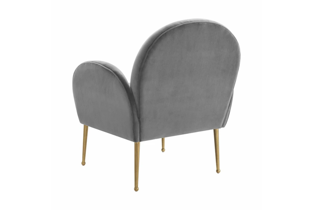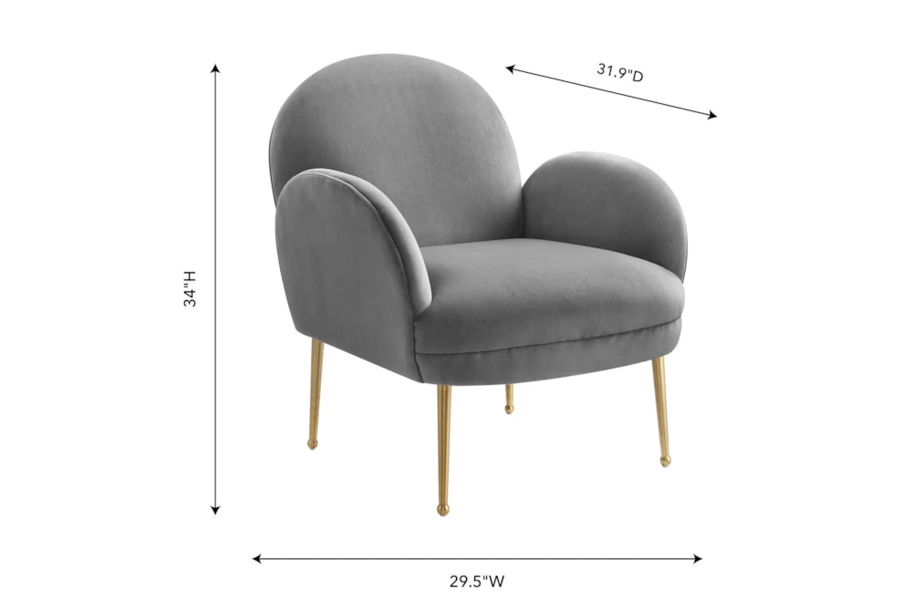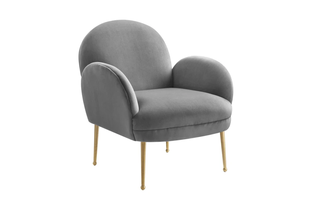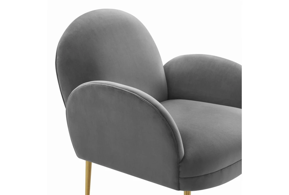 The Constance Grey Velvet Accent Chair is a contemporary style indoor chair with foam cushions, tight back, and arms, made of sumptuous grey velvet upholstery on a pine frame.