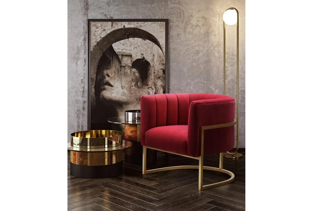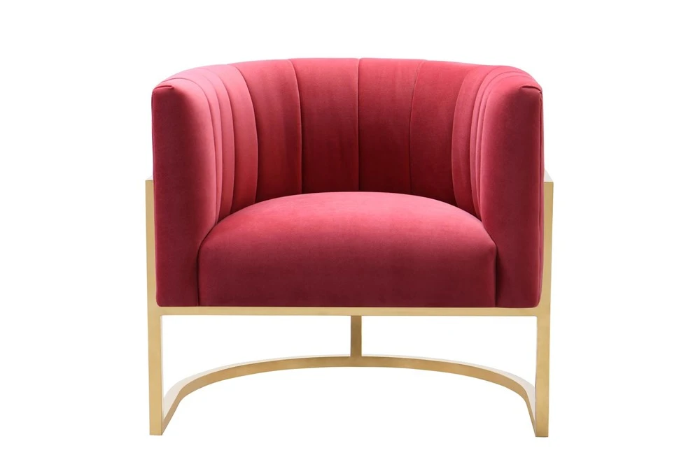 The Deanna Hot Pink Velvet Accent Chair is a contemporary style chair designed for indoor use in the living room. It features curved track arms, foam cushions, and a tight back upholstered in sumptuous hot pink velvet. This chair is channel tufted and comes with attached seat and back cushions, ships assembled, and is sold in a set of 2.