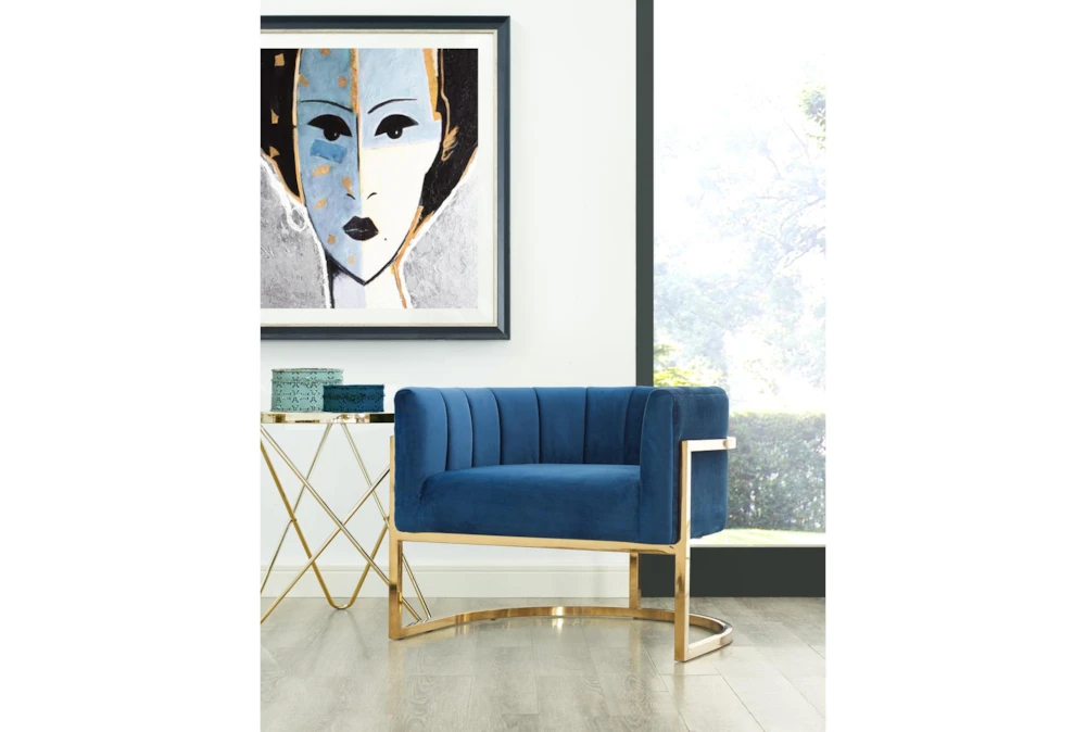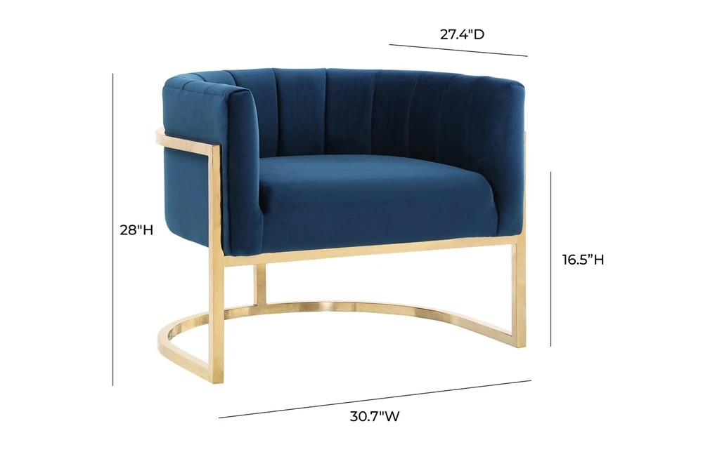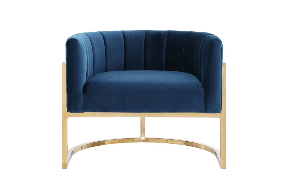 - The chair is upholstered in luxurious navy velvet fabric with a channel tufted back and features a sturdy stainless steel gold frame.