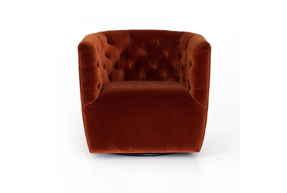 The Hanover Swivel Chair in Sapphire Rust is a modern, orange-colored chair made of fabric that features tufted, curved foam cushions, a tight back, and arms, perfect for small living spaces. Its swivel function allows for easy movement and its sapphire rust color adds a pop of color to any room.