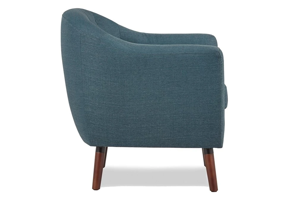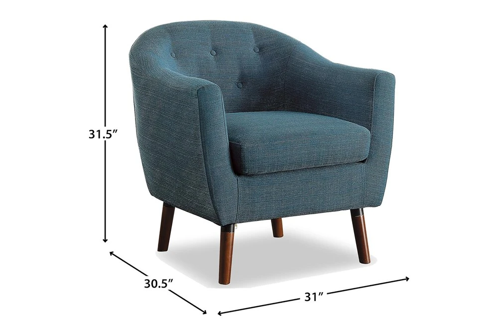 The Heaton Blue Accent Chair is a mid-century modern style chair made of wood, engineered wood, foam, and fabric, with a button-tufted chair back and tight back. It features track arms, foam cushions, and requires assembly.