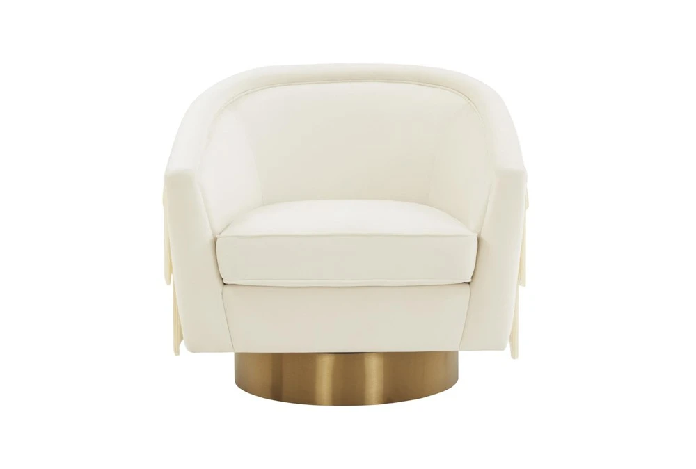 The Helen Cream Fringed Swivel Accent Chair is a modern addition to any living room, with a curved design, track arms, and tight back. Made of cream velvet and kiln-dried pine, this chair is handmade and features fringe detailing, a 360 swivel, and a removable seat cushion.