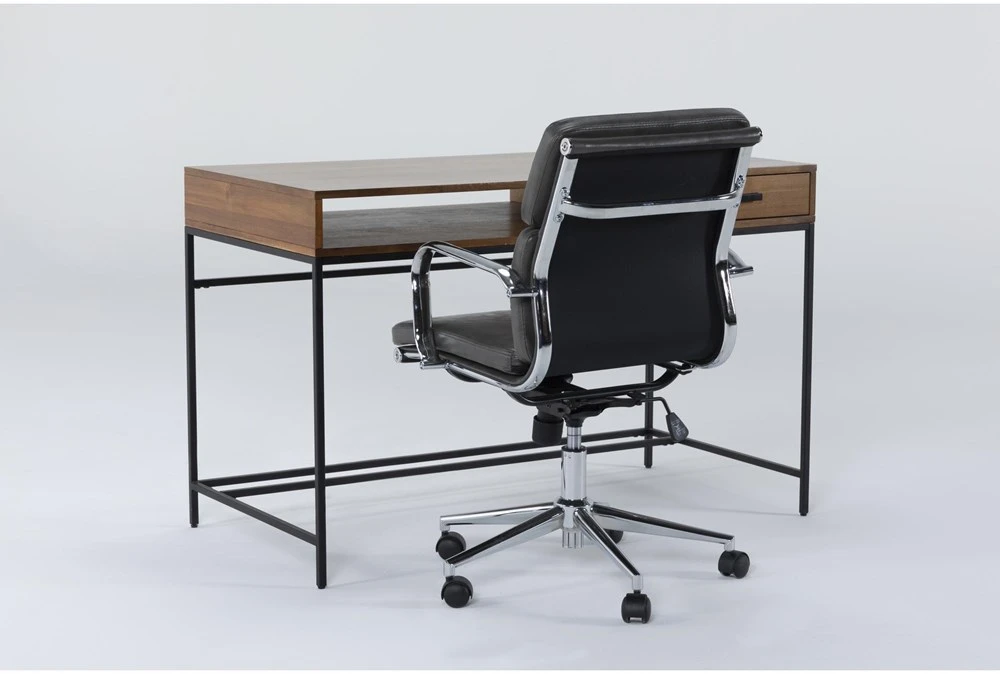 To do the best work, you need to create the best work space, and our Hollis writing desk will help your vision come to fruition. Minimal, streamlined and offered at a truly exceptional value, this piece is crafted with sturdy engineered wood, stylish acacia veneers and sleek steel in a powder-coated matte black finish. Special highlights include open and closed storage for office accoutrement. You’ve always wanted to sit in the executive chair, and now you can. Sophisticated and supportive, our Moby office chair provides powerful style and quality at an outstanding value. It’s available as a high-back or low-back design that comes in black and grey, so you can choose what looks best in your office. Handsome leather-like upholstery and a chrome-plated metal frame ensure maximum durability, while the caster base, swivel motion, gas lift and tilt lock function let you take charge of your comfort.