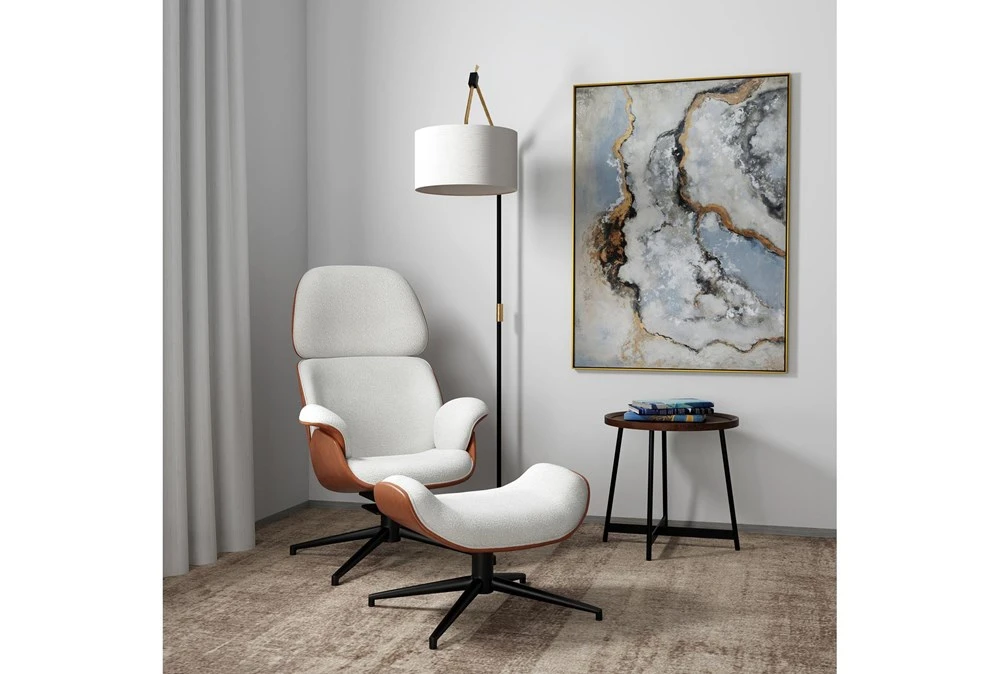 The Lena Ottoman is a modern, beige-colored piece that brings a sense of elegance to any living room. It features an ivory-colored fabric over a foam top section and a leatherette outer bottom section, all supported by a sturdy powder-coated steel base.