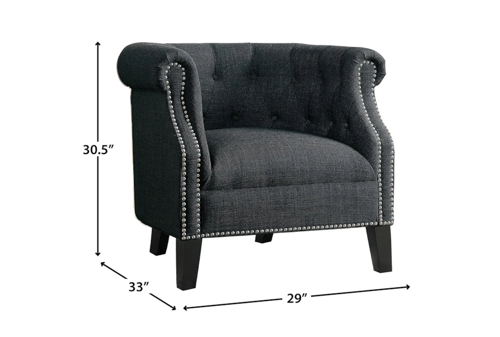 The Natalie Grey Accent Chair boasts a traditional style and features nailhead and tufted detailing, curved and rolled arms, foam cushions, tight back, and arms, making it perfect for indoor use in the living room or bedroom. Crafted from fabric and wood, this chair requires assembly and showcases a button-tufted barrel back and nailhead trim.