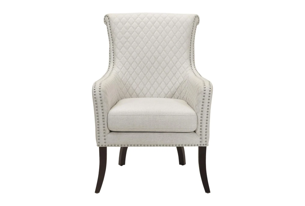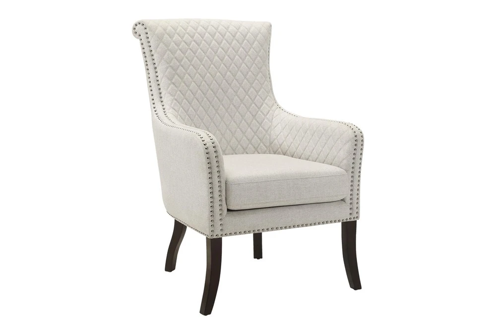 The Quintana Beige Quilted Accent Chair is a traditional style indoor chair made of fabric and wood. It features nailhead trim, tapered legs, track arms, foam cushions, a tight back, and a high back with cushion. Assembly is required.