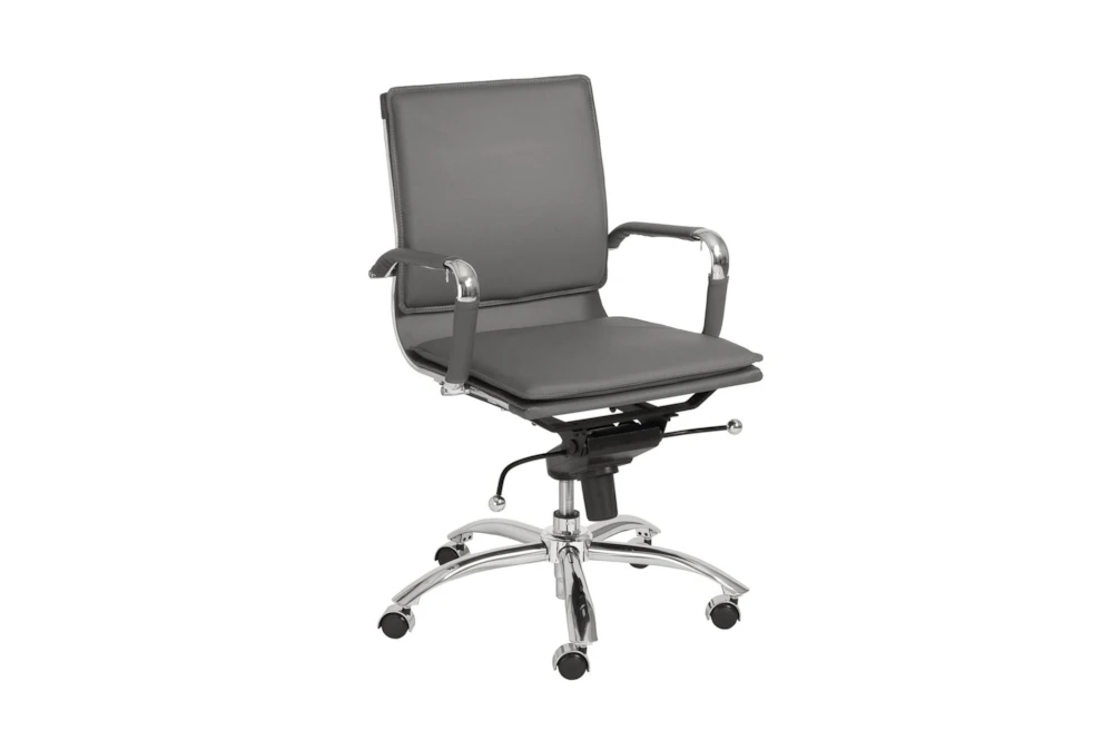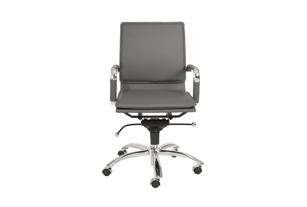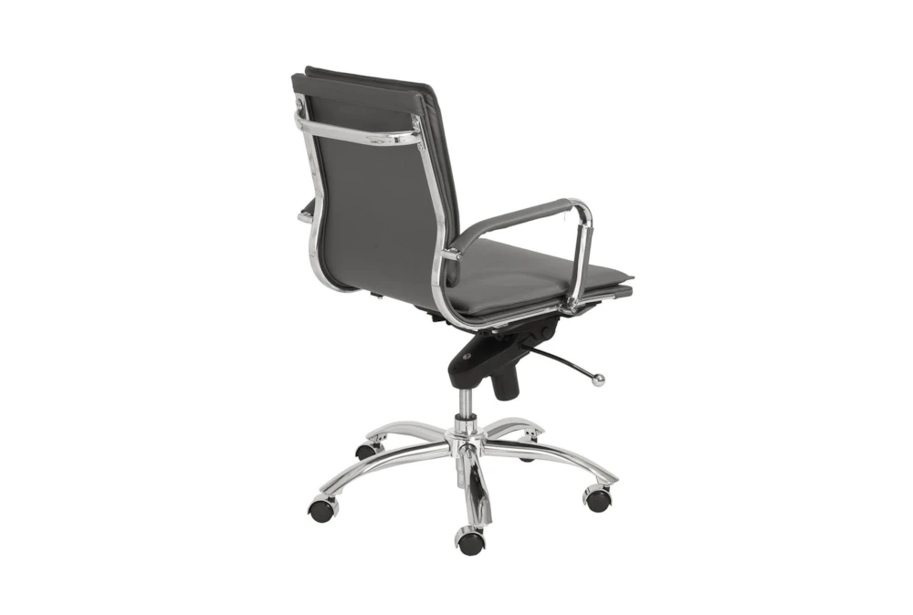This Skagen Grey Faux Leather and Chrome Low Back Desk Chair is the perfect addition to any contemporary office, featuring casters, wheels, arms, gas lift, swivel, ergonomic design, and rolling capabilities. The sleek and stylish design, combined with the comfortable leather material, makes it the ideal choice for any office setting.